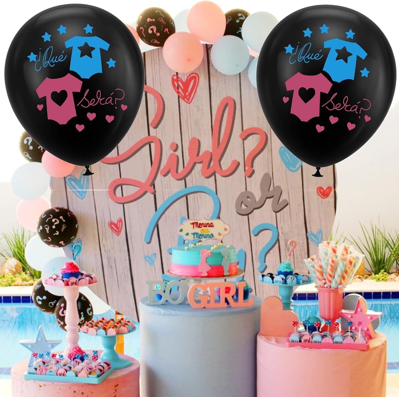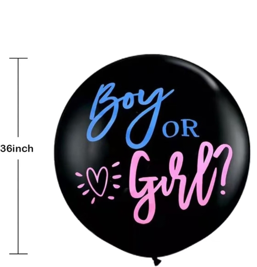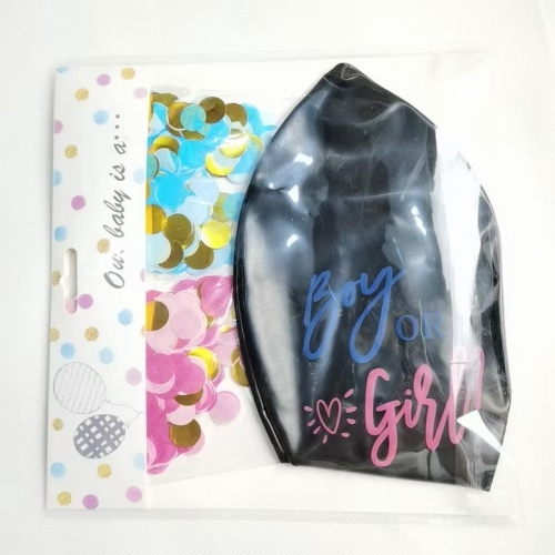 PentruBalon de dezvăluire a genului de 36 inchîn stoc, este de culoare neagră mat și are multe stiluri de imprimare, cum ar fi imaginea personaj băiat sau fată, băiat și fată sau altele legate de băiat și fată. Pentru confetti, o pungă este confetti de hârtie roz cu confetti de folie de culoare aurie, o altă pungă este confetti de hârtie albastră cu confetti de folie de culoare aurie.