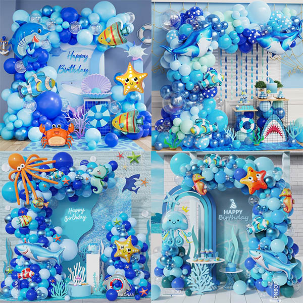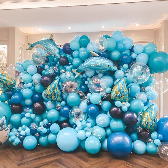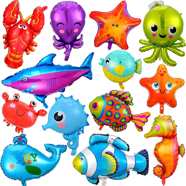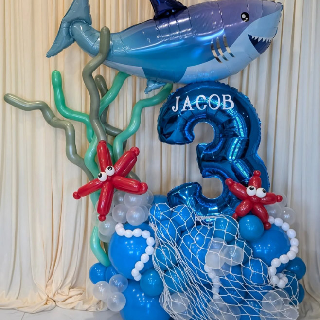 2. Ballonul cu folie:Garland cu baloane cu baloane cu folie de rechin, acest pachet este echipat cu baloane cu folie cu diverse creaturi marine de desene animate, cum ar fi rechini, stele de mare, meduze și cai de mare. În plus, putem proiecta, de asemenea, baloane personalizate pentru folie, în funcție de modelul dvs. pentru a crea o ghirlandă unică cu baloane cu baloane cu folie de rechin.
