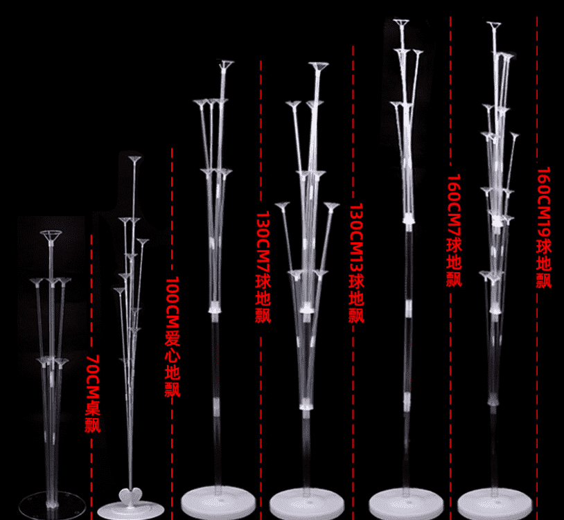 Produsul cu standuri cu baloane este de a oferi un cadru de suport și modelare stabil pentru balon, de a repara produsul cu balon într-o poziție specifică în funcție de cerere și de a combina balonul în diferite forme tridimensionale, cum ar fi arcul, copacul balonului, dragostea, etc., prin diferite tipuri de standuri, cum ar fi arcul, pilonul, masa și plutitorul la sol, etc., pentru a adăuga concentrare vizuală la locul activității. Fixați balonul pe sol, masă, colț și alte poziții desemnate pentru a împiedica balonul să plutească în voie și asigurați -vă că aspectul decorului este curat și ordonat.