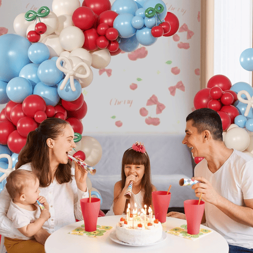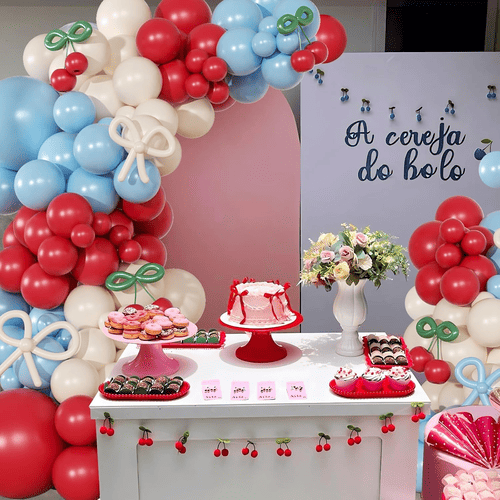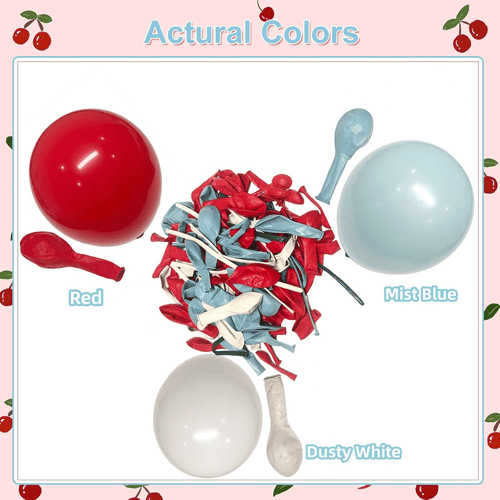 Arcul balonului cu flori de cireș vine cu diferite baloane din latex, inclusiv balon rotund din latex și balon lung din latex. Stilul total al trusei este pozitiv și drăguț, a fost îndrăgit de clienții din întreaga lume. Culorile baloanelor rotunde din latex sunt roșu, alb praf și albastru ceață. Și pentru balonul lung din latex este albastru ceață, alb praf și verde, baloanele lungi din latex sunt folosite pentru a face stilul papion și stilul cireș.