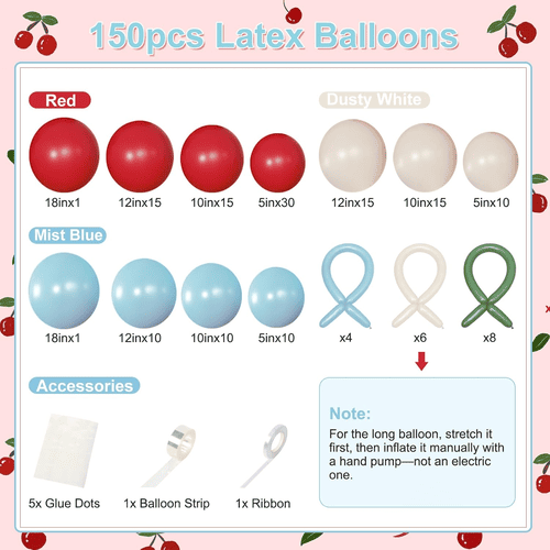 Balonul din latex din arcul balonului cu flori de cireș este fabricat 100% din latex brut, care este importat din Asia de Sud-Est. Materialul este ecologic și total inofensiv pentru copii și adulți. Dimensiunile lor sunt de la 5 la 18 inci. Baloanele roșii de latex de 5 inci și baloanele lungi de latex verde sunt folosite pentru a face stiluri drăguțe de cireșe.