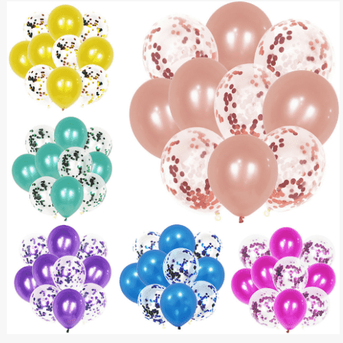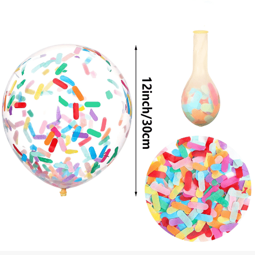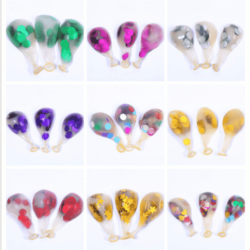 Baloanele confetti folosesc de obicei baloane transparente din latex de 12 inch. Fiecare balon conține 1 g confetti și fiecare pachet poate conține 100 de bucăți. Baloanele confetti de această dimensiune sunt folosite frecvent și au rezultate mai bune, fie în costume de baloane mici, fie în truse de coroană de baloane.