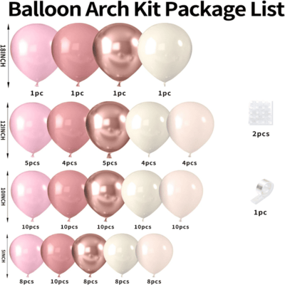 Kit mic balon roz praf:Acest kit mic este compus din 50 până la 80 de baloane roz. Pentru a îmbunătăți efectul de stratificare al setului, puteți adăuga și baloane albe, caise și transparente. Folosiți heliu pentru a le umple și apoi puteți folosi o panglică pentru a lega și apoi lăsați-le să plutească în aer.