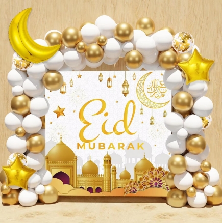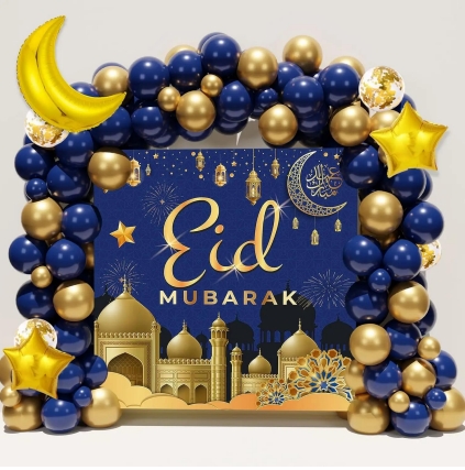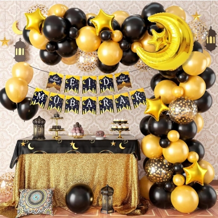 Seturile de ghirlande de baloane Eid al-Fitr marca Niun® conțin de obicei o varietate de articole, cum ar fi baloane din latex cu tematică Eid și baloane din folie de diferite dimensiuni și culori, fundal, fețe de masă, linii de pescuit, lanțuri de baloane, puncte de lipici, pompe de aer manuale sau electrice etc. decor al-Fitr pentru a satisface diferitele nevoi ale consumatorilor.