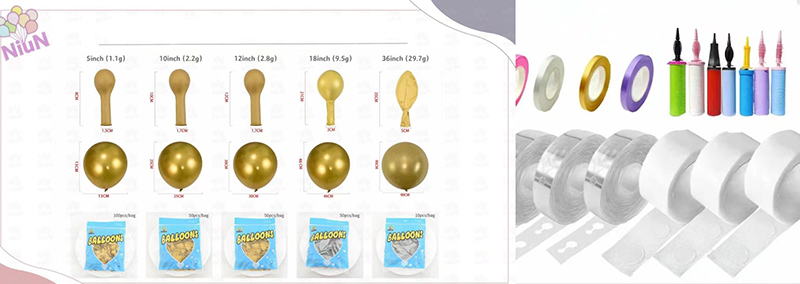 Arcul are lanț de baloane Niun®, puncte de adeziv și fir de pescuit. Utilizatorii îl pot construi în orice mod pentru a se potrivi spațiului. Poate fi realizat ca kit de ghirlande sau ca decor de perete. Poate face ca întreaga formă să aibă mai multe straturi. Amestecul de dimensiuni ale baloanelor face ca forma să pară mai tridimensională și mai plină de viață. De asemenea, putem oferi piese suplimentare pentru baloane sau putem stabili cantități personalizate. Poate satisface nevoi diferite pentru diferite scene de decorare.