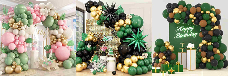 Puteți folosi baloane de culoare alb sau alb pară cu arc de balon verde și auriu. Va deveni moale și cald și va fi asemănător cu surprinderea prospețimii unei grădini de primăvară; atunci când este asociat cu baloane de culoare roz, poate crea o senzație vibrantă care este dulce, fără a fi stânjenitoare, infuzând o atmosferă romantică în baby showers și petreceri cu tematică pentru fete; chiar și atunci când sunt combinate cu culori mai profunde, cum ar fi negru și maro, culorile verde și auriu pot echilibra profunzimea și stabilitatea acestor nuanțe cu tensiunea sa uimitoare a culorilor, creând o ambianță de sărbătoare modernă, dar caldă.