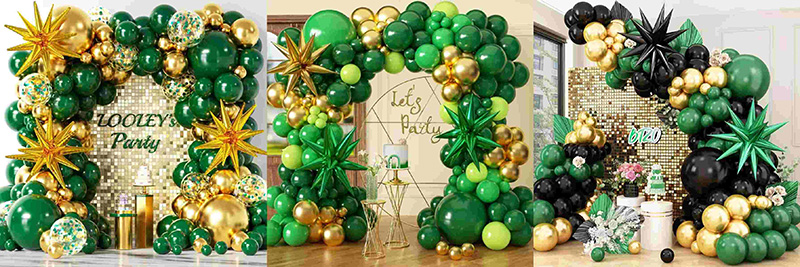 Arcul balonului verde și auriu folosește ca idee principală tonuri naturale și de lux. Amestecul de verde și auriu face un aspect de petrecere proaspăt și elegant. Arcul are multe nuanțe de verde, cum ar fi verde închis mat, verde fasole retro, verde avocado retro, verde închis retro și așa mai departe. Fiecare culoare arată propriul strat și textură. Baloanele aurii se potrivesc bine cu verdele. Cele verzi aduc o senzație de calm și natural. Cele aurii adaugă strălucire și o notă de lux. Cele două culori se completează reciproc. Ele creează o atmosferă sofisticată și elegantă.
