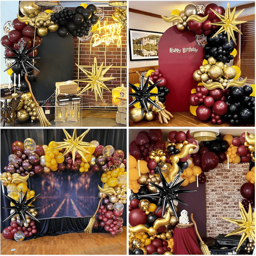 Balonul din latex din arcul de balon cu tematica Harry Potter este realizat 100% din latex brut, care este importat din Asia de Sud-Est. Deoarece sunt materiale naturale, sunt total ecologice și inofensive pentru copii și adulți. Culorile lor sunt culori simbolice ale filmelor Harry Potter, inclusiv roșu vin, galben, negru și auriu. Pentru a adăuga mai multe straturi, am adăugat și balonul confetti, confettiul este auriu metalic.