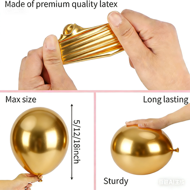 Baloanele din latex pe care le punem la dispoziție pentru trusa de ghirlande de baloane sunt realizate 100% din latex natural, care a fost importat din Asia de Sud-Est. Dimensiunile acestora sunt de 5 inch, 10 inch 12 inch și 18 inch, prin aranjarea lor în diferite dimensiuni, se poate crea un efect de stratificare atractiv.