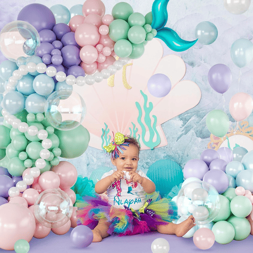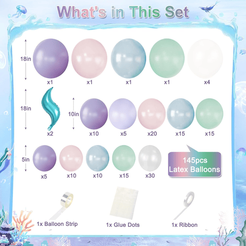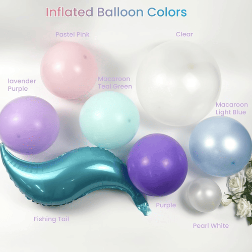 Baloanele din ghirlanda de baloane Mermaid vin cu mai multe culori, cum ar fi mov, lavandă, roz pastel, albastru deschis, verde teal, alb perlat și transparent, împreună cu decorațiuni din folie de coadă de sirenă, făcându-l grozav pentru a crea o petrecere magică cu tematică oceanică de sirene.