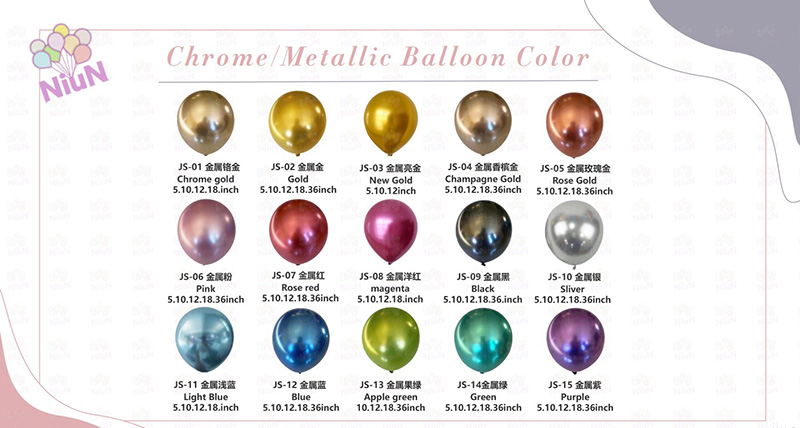 Folosim tehnologie de acoperire cu cerneală importată pentru baloanele noastre metalice. Culorile sunt uniforme și bogate. Luați ca exemple pe cele din imagini. Acestea includ auriu metalic de șampanie, albastru metalic și violet metalic. Aceste culori s-au dovedit populare pe piețele europene și americane. Se potrivesc cu multe ocazii. Aceste ocazii sunt nunți, zile de naștere și aniversări.