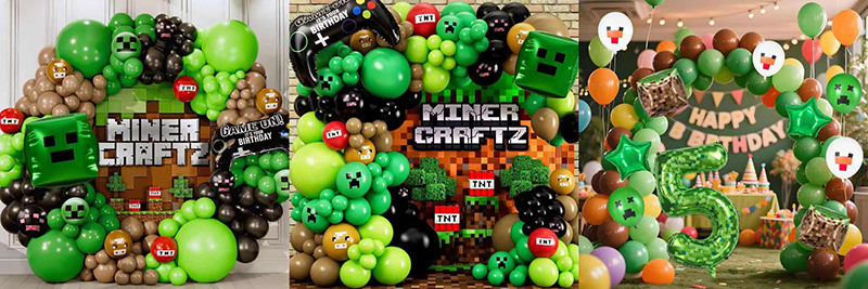 Minecraft baloane în formă specială se amestecă imaginația și elementele de joc. Au multe forme de caractere 3D. Personajele includ Steve, Creeper și Enderman. Fiecare copiază detaliile jocului. Există, de asemenea, articole precum săbiile cu diamante, blocurile TNT și controlerele de jocuri. Ei fac ca decorațiunile de petrecere să fie mai distractive și bogate. Fiecare balon folosește un stil de pixeli. Creeper are un corp de bloc verde. Steve are o cămașă albastră. Detaliile fac ca lumea blocului să se simtă ca la petrecerea reală.