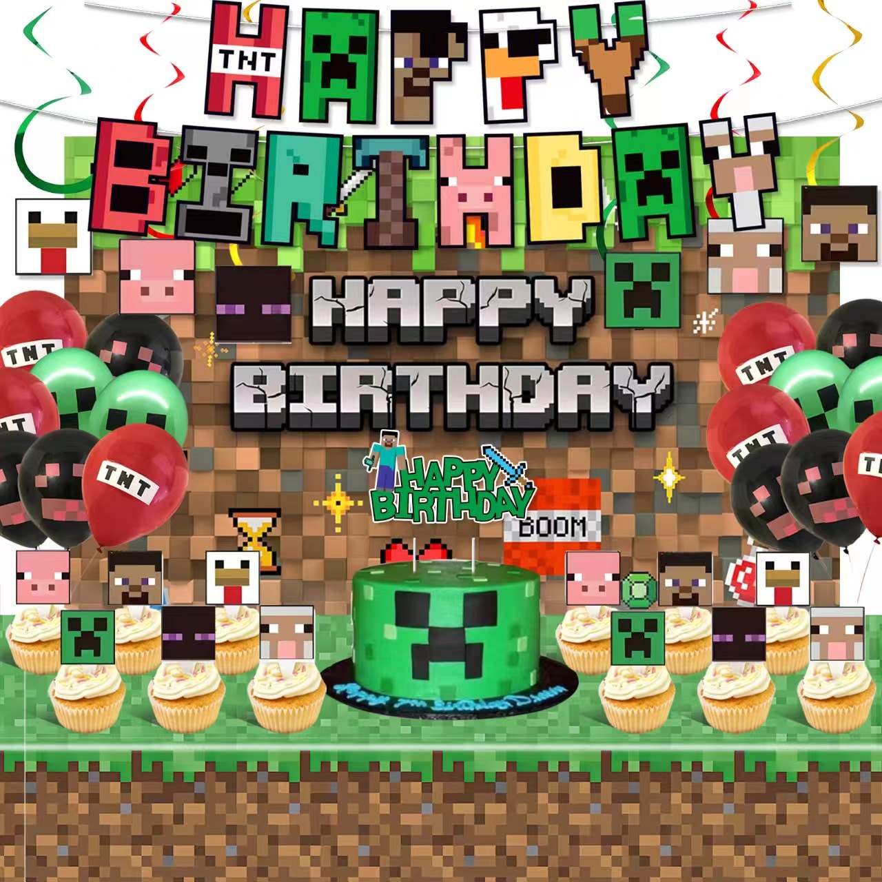 Bannerele de hârtie Minecraft iau la mulți ani ca ideea principală. Literele și părțile mici au un aspect puternic de pixeli. Unele scrisori sunt realizate din formele lui Steve, Creeper, Enderman. Unele litere au TNT, Diamond, pui. Fiecare mică parte arată stilul jocului în Minecraft. După spânzurare, bannerul arată rapid tema petrecerii. Oferă spațiului o senzație de naștere strălucitoare.