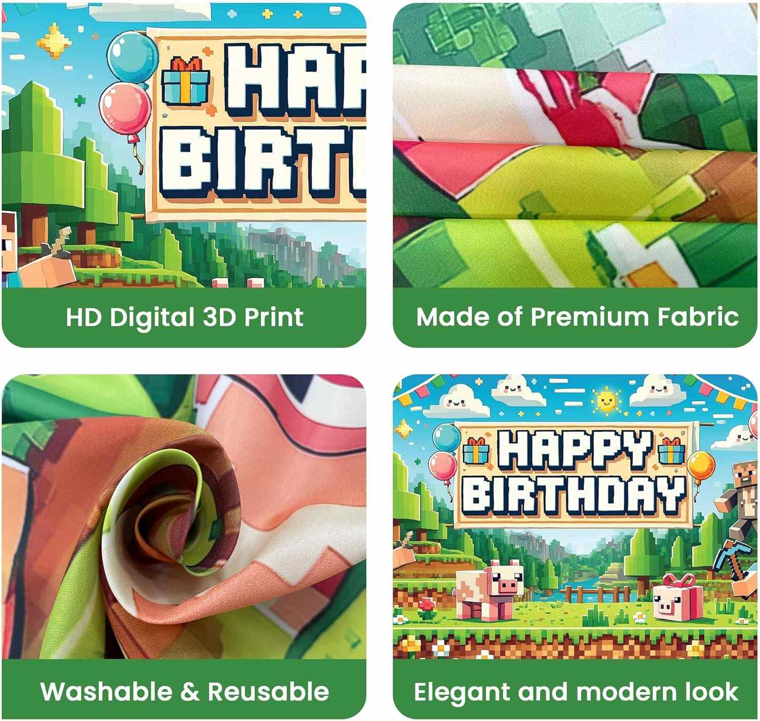 Fundalul Minecraft este principala parte vizuală a scenei petrecerii. Designul ia idei din piesele clasice ale jocului. Prezintă Sky Pixel, iarbă, copaci, clădiri și Steve. Aceste părți se alătură pentru a face o scenă mondială cu bloc complet. Imaginea are o culoare strălucitoare. Imaginea are straturi bogate. Cuvintele la mulți ani în stil pixel arată clar. Cuvintele atrag atenția. Fundalul face ca locul petrecerii să se simtă ca un teren de joc simultan.