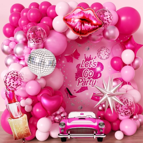 Seturile includ baloane din latex roz mat de 5 inch și 12 inch, baloane latex roz perlat de 5 inch și 12 inch, baloane latex roz metalic de 5 inch și 12 inch, baloane latex alb de 5 inch și 12 inch, baloane latex roz confetti de 12 inch și baloane latex alb de 18 inchi, Baloane din folie stea de 18 inch, perdea din folie roz, baloane din folie roz La mulți ani, decorațiuni și accesorii cu fluturi, cum ar fi puncte de lipici, benzi de baloane și panglică.