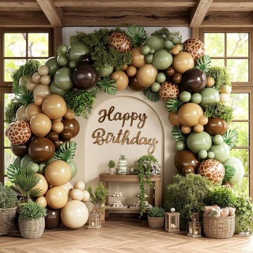 Arcul cu balon Safari prezintă elemente de bază ale unei teme de pădure. Baloanele maro reprezintă trunchiuri de copac, baloanele verzi simbolizează frunzele, iar diverse baloane imprimate înfățișează diferite animale, creând senzația de a găzdui o petrecere chiar în pădure. Creează fără efort o scenă de petrecere elegantă și atmosferică.