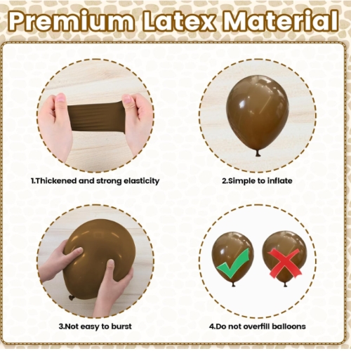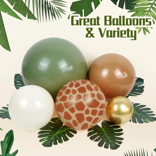 Există mai mult de 100 de baloane din latex pentru fiecare arc de balon Safari. Include baloane din latex verde închis de 5 inch, 10 inch și 18 inch, baloane latex verde avocado de 5 inch, 10 inch și 18 inch, baloane latex maro de 5 inch, 10 inch și 18 inch, baloane latex de 10 inch, alb nisip, baloane de latex de 10 inch, 10 inch, verde, 10 inch. Baloane din latex auriu cromat, baloane din latex confetti de 12 inch, baloane cu imprimare girafe de 12 inch, baloane cu imprimare tigru de 12 inch și accesorii pentru baloane.