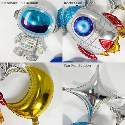 Baloanele din folie au astronauți, rachete, farfurii zburătoare și alte stiluri, care adaugă mult interes și realitate acestei ghirlande.