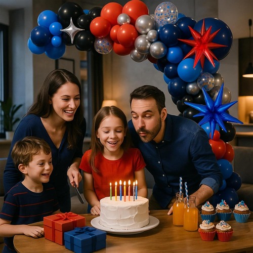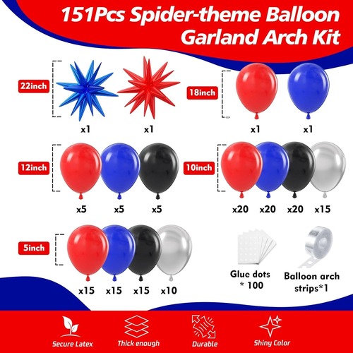 Culorile principale ale setului de baloane sunt albastru, roșu și negru. Cele trei culori distinctive vă vor face să vă imaginați figura cool a lui Spider-Man din film. Baloanele din latex din acest set includ balon roșu mat, balon albastru mat, balon negru mat, balon metalic. Balonul din folie din acest set este un balon din folie cu stea de explozie, culoarea este albastru și roșu.
