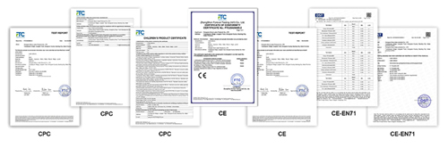 Gama noastră completă de produse a trecut de CPC, CE, EN71 și alte certificări autorizate, în strictă conformitate cu reglementările de siguranță europene și americane și alte piețe țintă. Aceste calificări vă pot ajuta mărfurile să vă vamale fără probleme și să evite complet riscurile de conformitate pe piețele de peste mări.