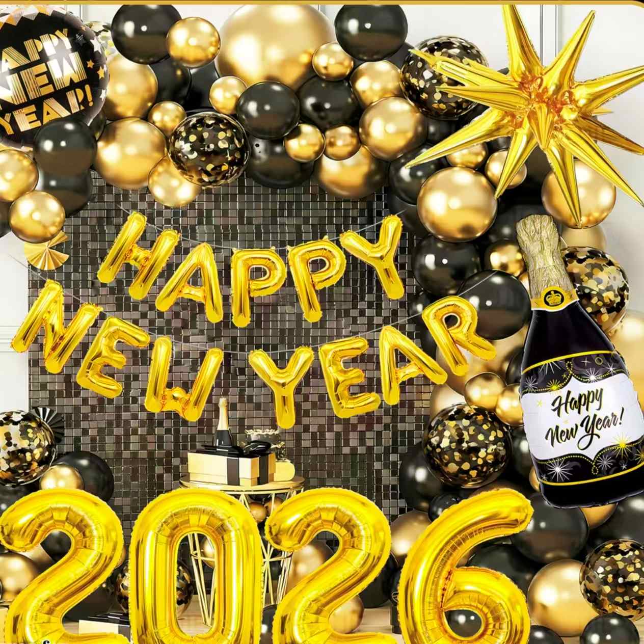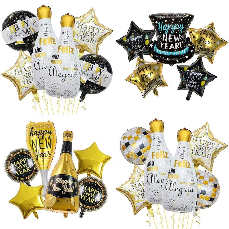Gândiți-vă la setul cu tematică de Anul Nou. Are baloane din folie care arată ca sticle de șampanie. Include, de asemenea, baloane cu numere „2026”, baloane decorative cu stea și multe altele. Culorile principale sunt negru-auriu sau auriu-alb. Este plin de bucurie festivă de Anul Nou. Poate face cu ușurință o scenă de petrecere de Anul Nou luxoasă și ceremonială.
