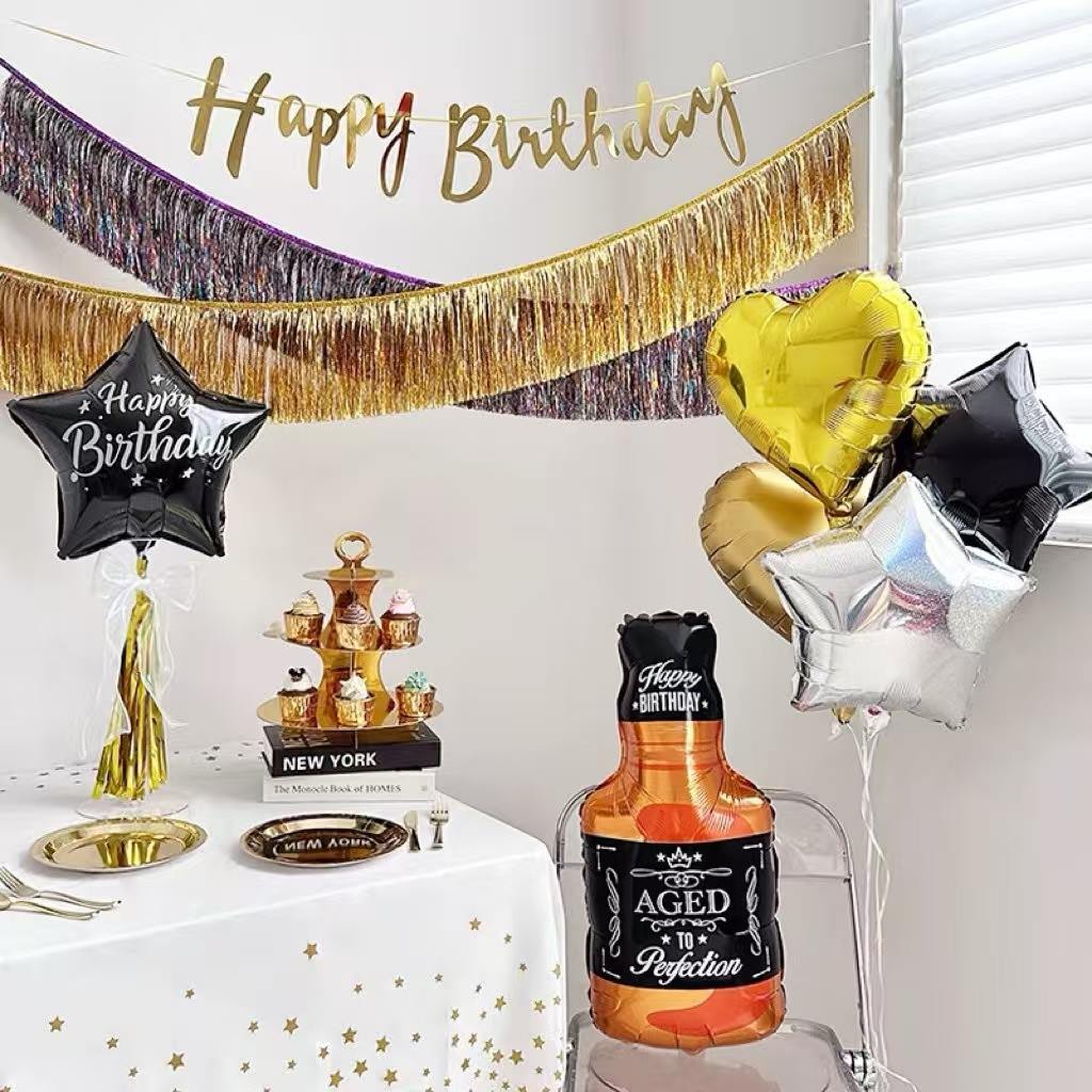 Există și un set pe tema zilei de naștere. Baloanele roz și drăguțe pentru sticle de vin sunt proiectate cu baloane din folie în formă de inimă și baloane cu litere „La mulți ani”, iar culoarea aurie roz este foarte romantică și caldă. Adaugă o senzație dulce petrecerii de ziua de naștere.